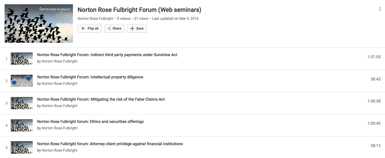 Norton Rose Fulbright use their YouTube channel as an opportunity to offer training to lawyers. They regularly upload podcast style videos following a presentation providing key notes. Known as ‘Web Seminars’, these videos can help with lawyers self-study and provide them with easy access to content.