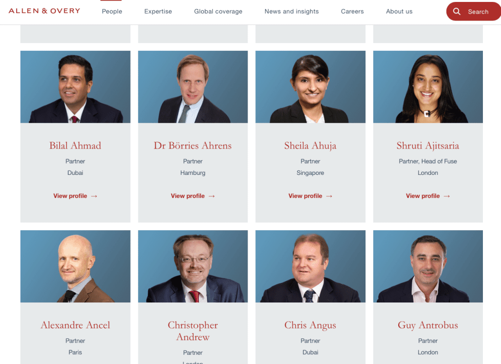 37% of the law firm websites use a mixture of people standing side on and face on, and let the lawyers position themselves to what feels more natural. For example, Allen & Overy use a mixture of face on and side on profile images.