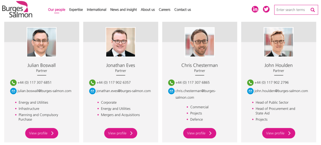 Depth of field is the distance between the nearest and furthest objects that are sharp in an image. It allows control over what appears in focus and what is blurred. 37% of law firm websites use a blurred background in their profile image. This puts greater focus on the person in the photograph. It allows you to take photographs in different locations at your own convenience but still create a unified overall design. You can see this in Burges Salmon’s website, as shown below.