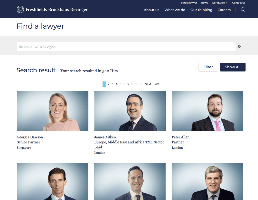 An example of a website that uses standardised images is Freshfields Bruckhaus Deringer. All their profile images are consistent. They have been cut out and then placed onto the same light blue background.