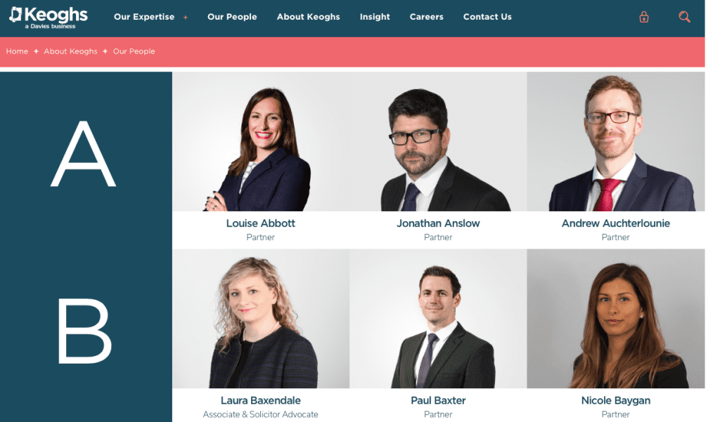 As you can see from the graph above, we found that most law firm websites use profile images where the lawyers are standing side-on, but still looking at the camera to show a more flattering angle. You can see this in Keoghs’ website as shown below.