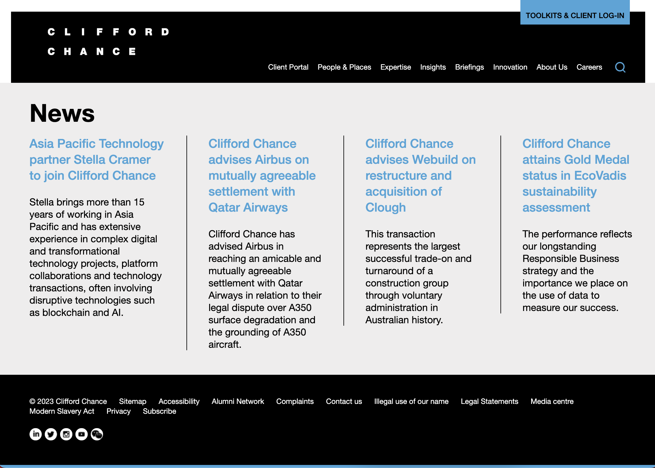Clifford Chance uses light blue as their feature colour on their website as displayed below.