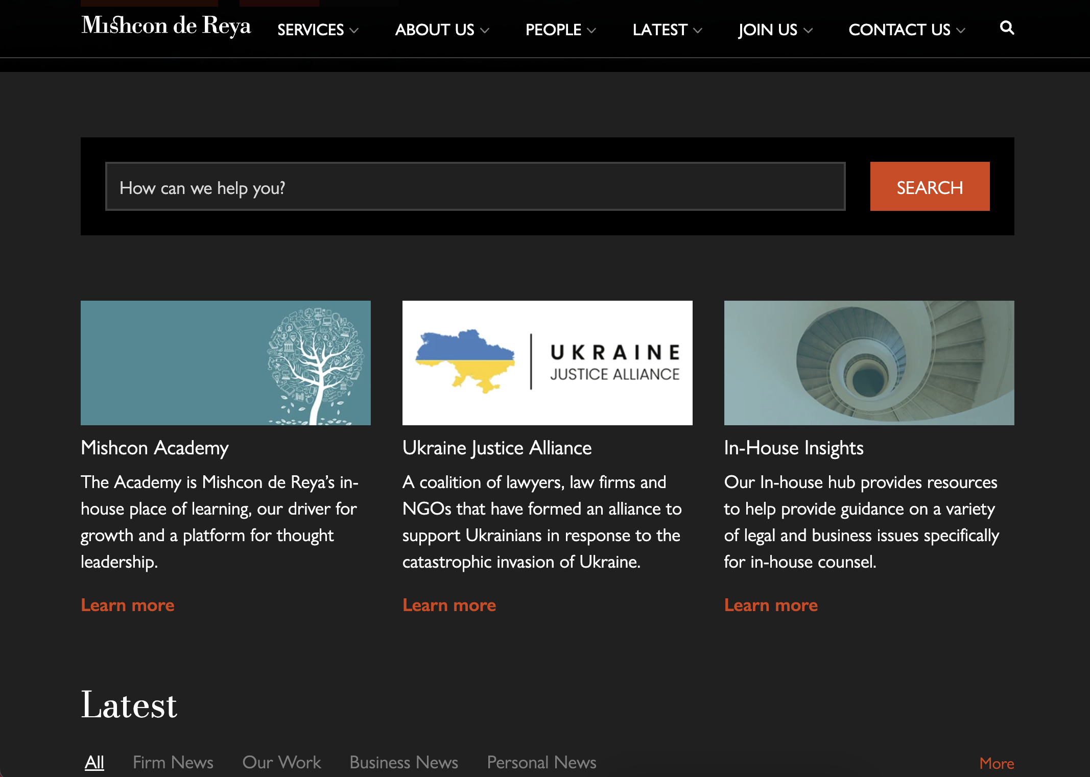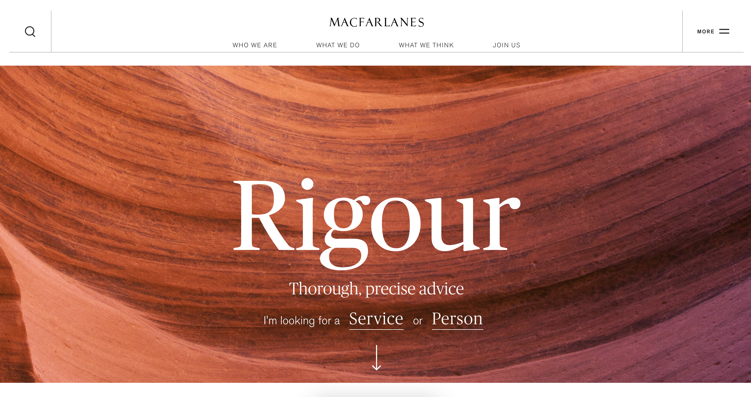 Similarly to Clifford Chance, Macfarlanes have used a white background to their website with black and peachy red as more of a feature colour. This creates a crisp look and feel to the site and helps the brand focus on the imagery and other elements used. This style website helps Macfarlanes use a variety of styles of imagery while always matching with the brand.