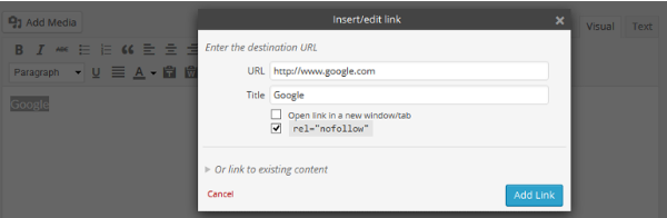 Rel Nofollow checkbox is a really simple WordPress plugin that adds a checkbox to the CMS when you insert a link on the popup WordPress post editor.