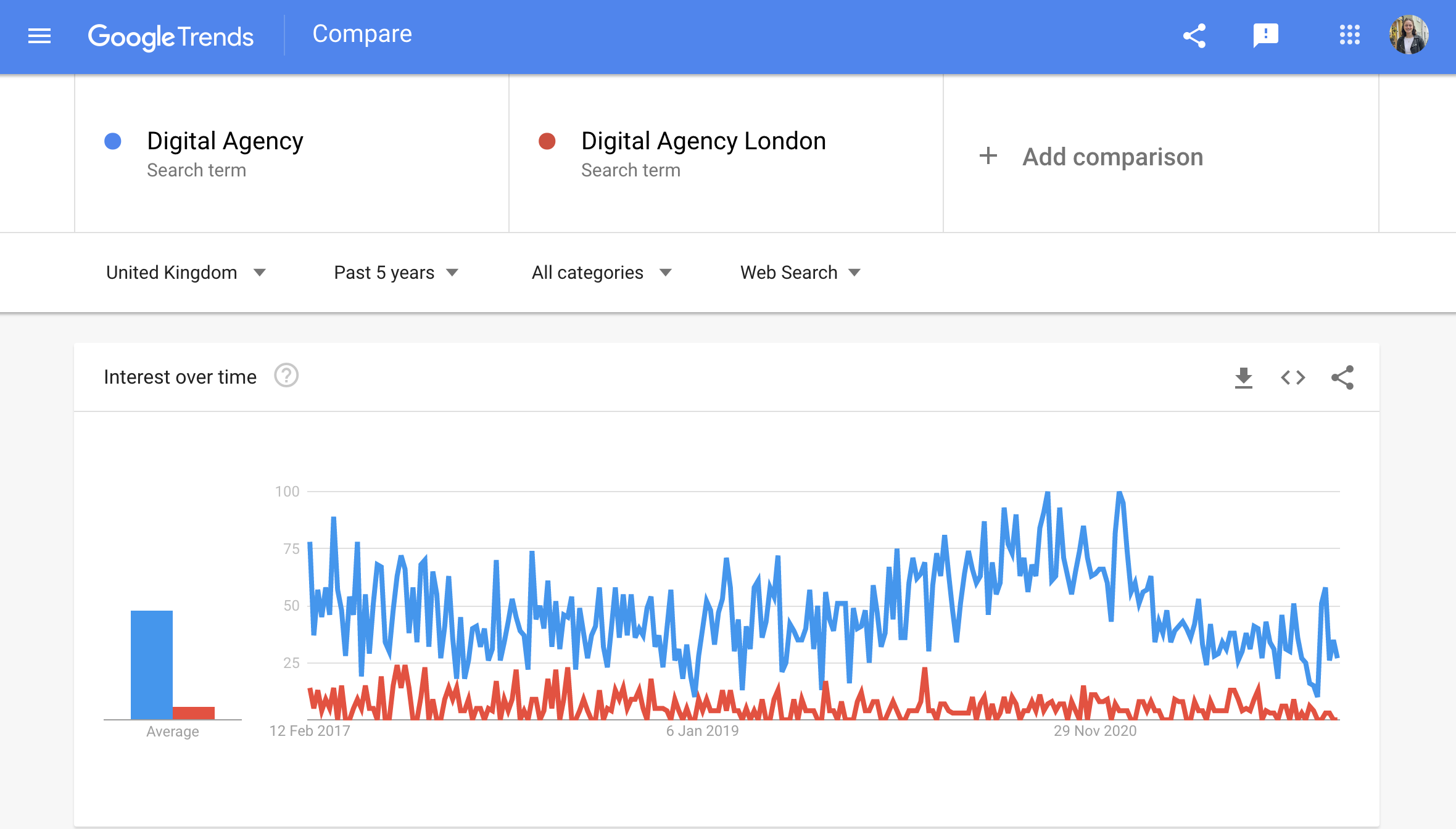 By changing the time frame you can see data over different periods of time to see if there is a correlation that you can predict. For example, for my keywords ‘digital agency’ and ‘digital agency london’ it looks like the data has just had a slight downfall but over the last 5 years it has been up and down various times so I can predict that searches for this keyword are going to increase in the next year or so.